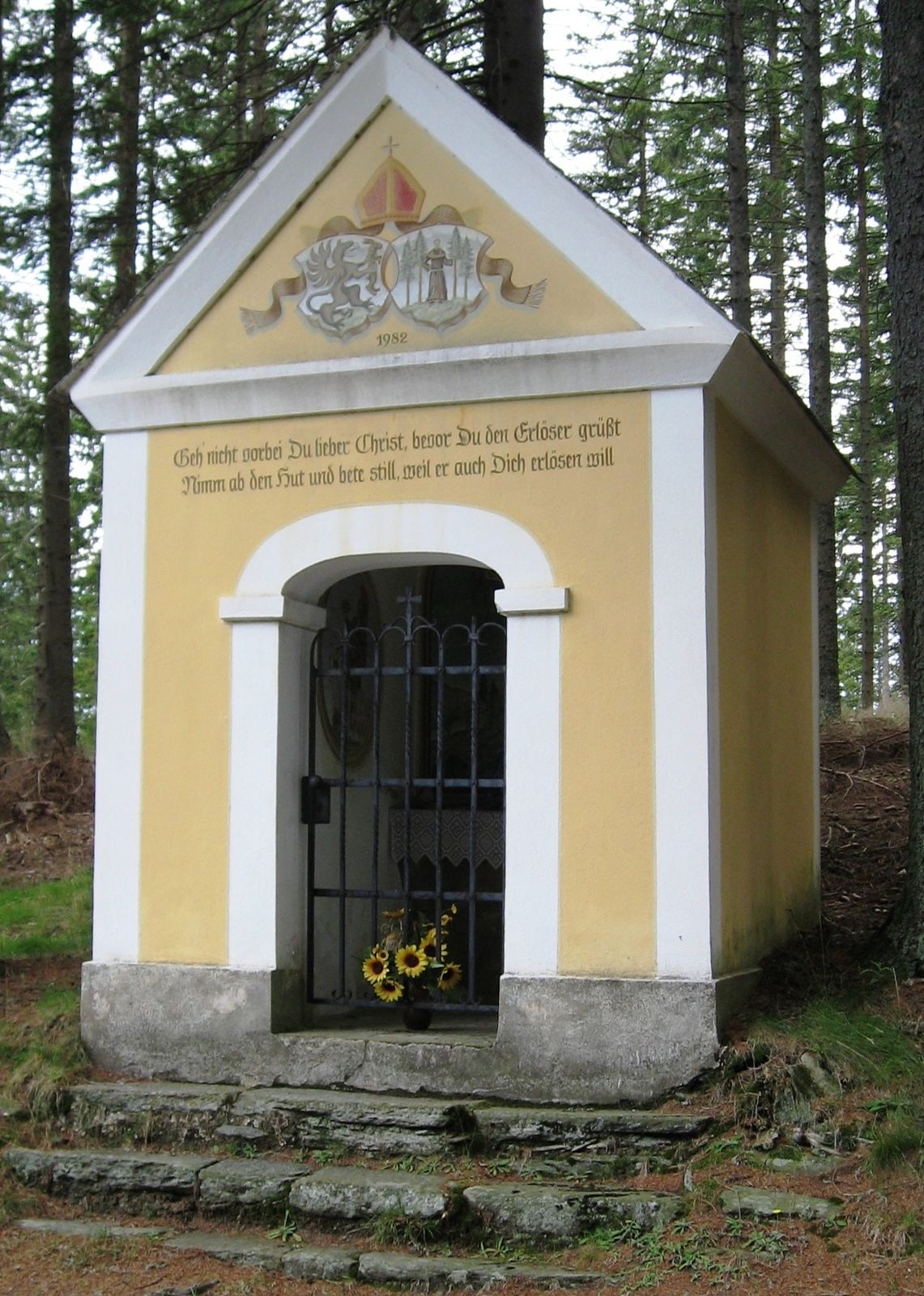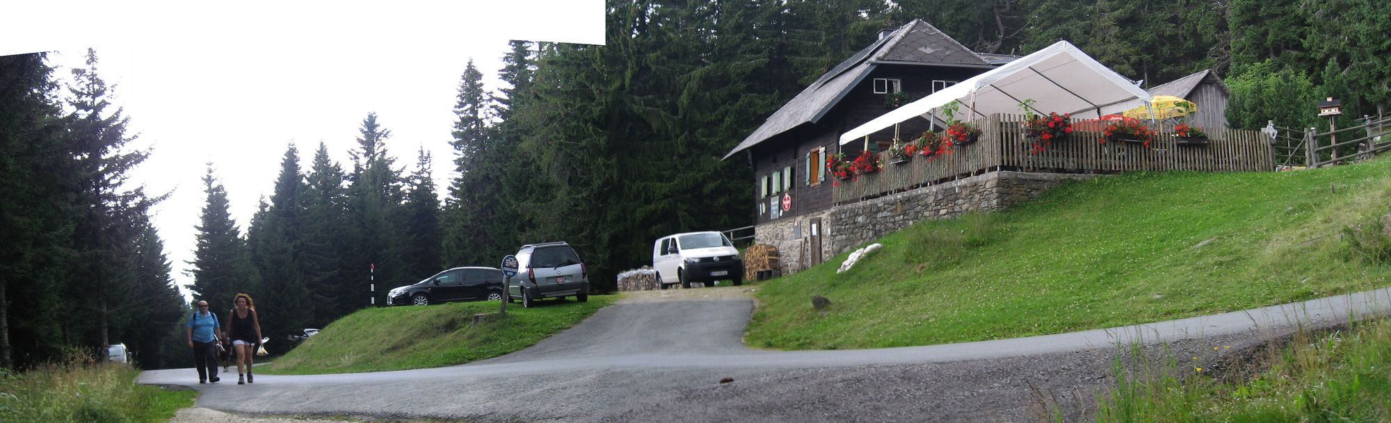 Nach rd.1,5km beim Gmeinkreuz (Mönichwalder Schwaig) wieder raus auf die Mautstraße (rd.7,8km auf rd.1.270m) und dieser folgend bis zur Kaltwiesenhütte, (rd.8,8km auf rd.1.370m) wo halbrechts in einen Waldweg zur Kaltwiese abgebogen wird.