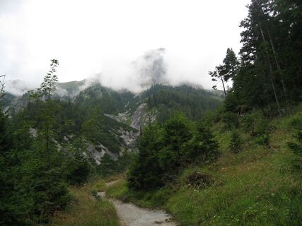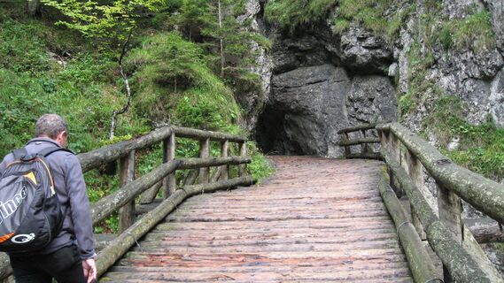 Von hier weg über eine Engstelle zwischen Felsen über Holzstämme einer Brücke zum Fölzboden (rd.2,0km auf rd.880m) und hoch zur Schlagalm (rd.2,5km auf rd.980m)