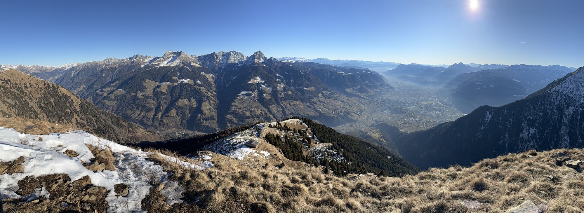 Kurzer knackiger Anstieg (und Abstieg) mit atemberaubendem Ausblick auf Meran, das Passeiertal, und weiter oben auf Ortler Gebirge, Texelgruppe und Rosengarten.