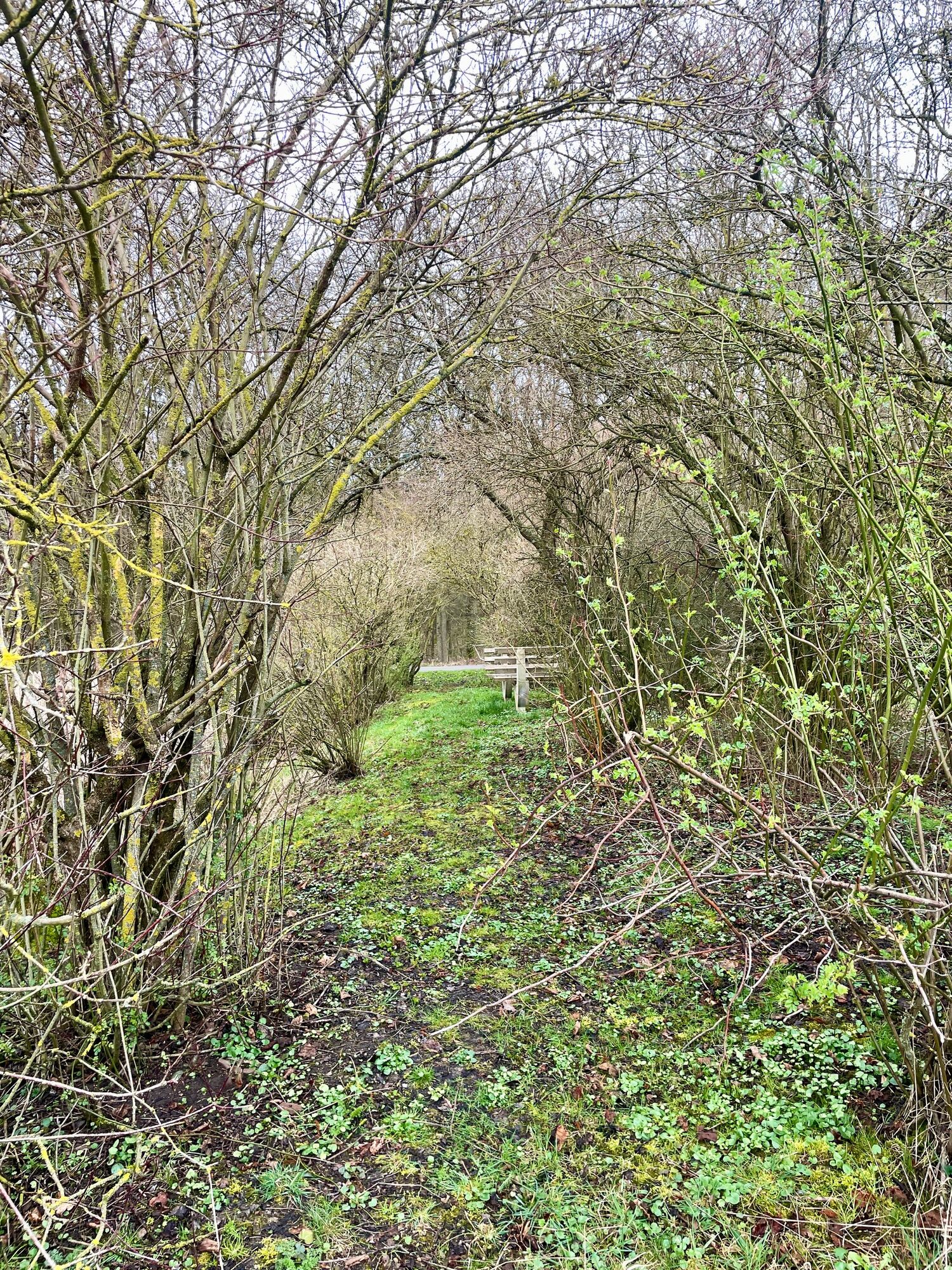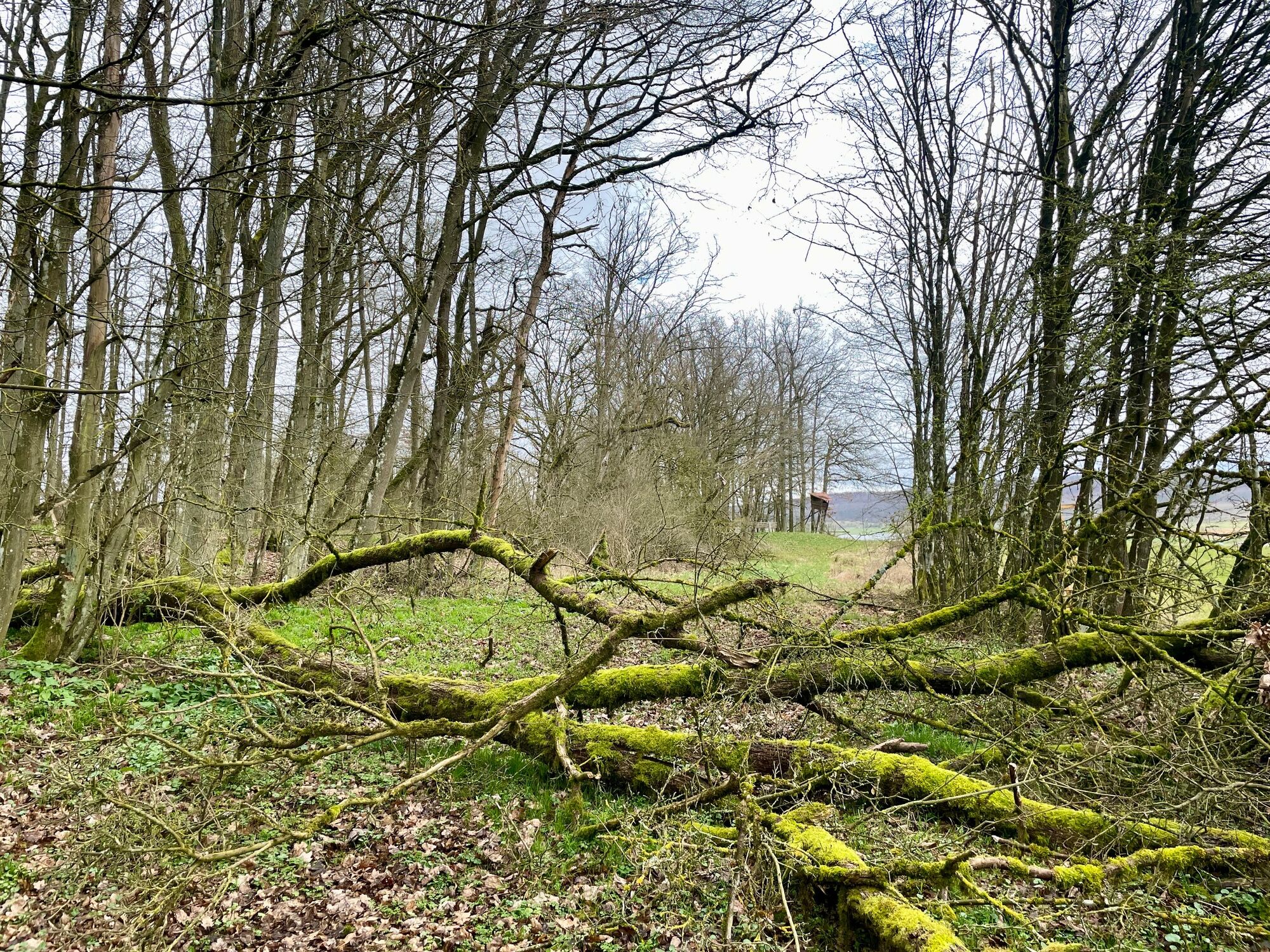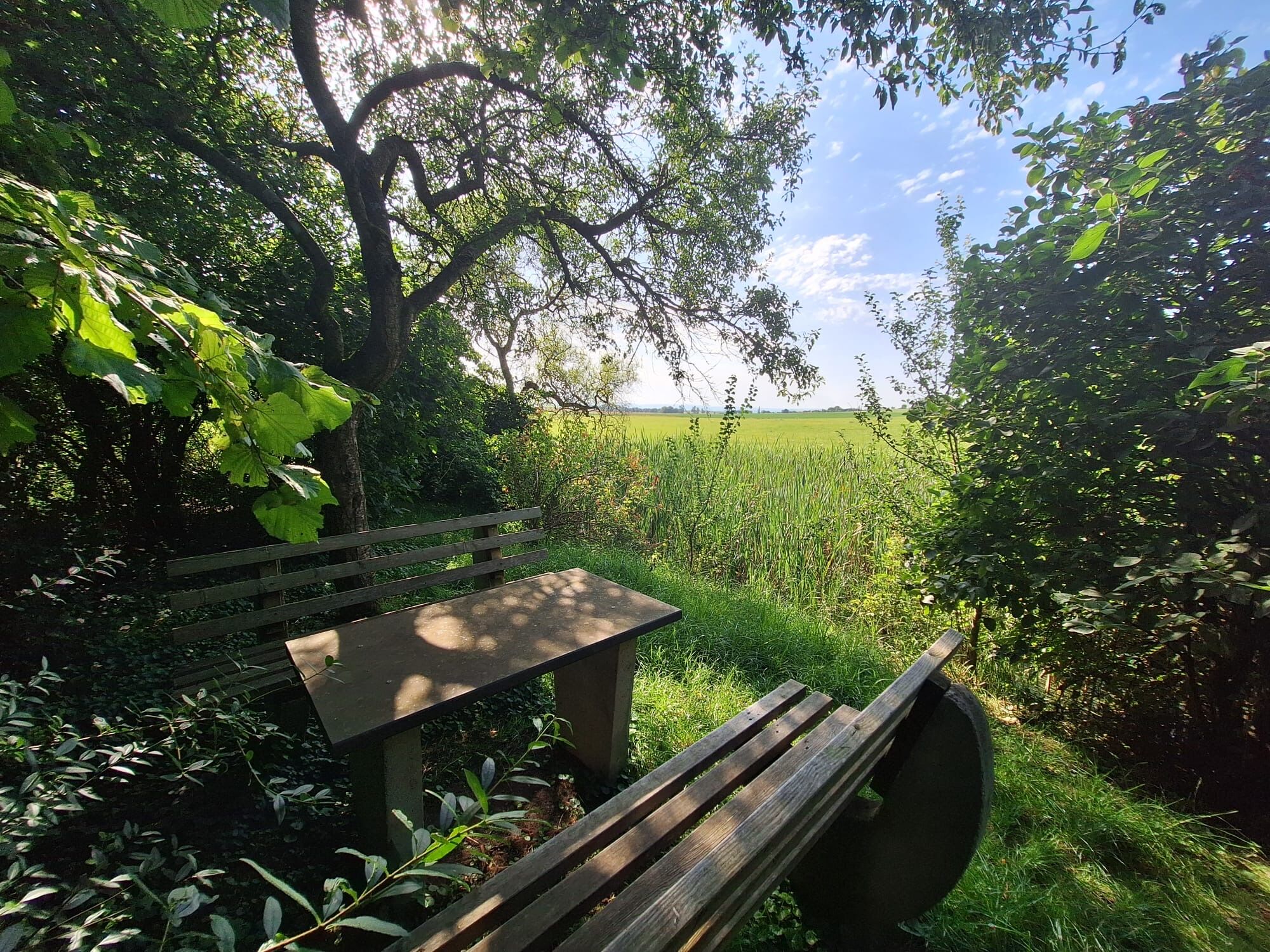 Das Ziel ist eine kleine, idyllische Bank, umgeben von Schilf und Grün. Nun haben wir das ehemalige Hammelsbad erreicht, ein Ort an dem früher auch die Schafe geschoren wurden. Das Wasser kommt direkt aus dem Wald und hat früher auch als Erfrischung für die Tiere gedient. Nach einer Rast führt der Weg links in den Wolfmannshäuser Wald auf einem befestigten Pfad. Halte dich immer geradeaus, bis du eine Lichtung mit einem Schlagbaum erreichst. Biege links am Waldrand entlang ab, vorbei an verwunschenen, moosbewachsenen Baumstämmen, in Richtung einer weiteren Sitzbank mit schöner Aussicht auf den Wald und die Flur.