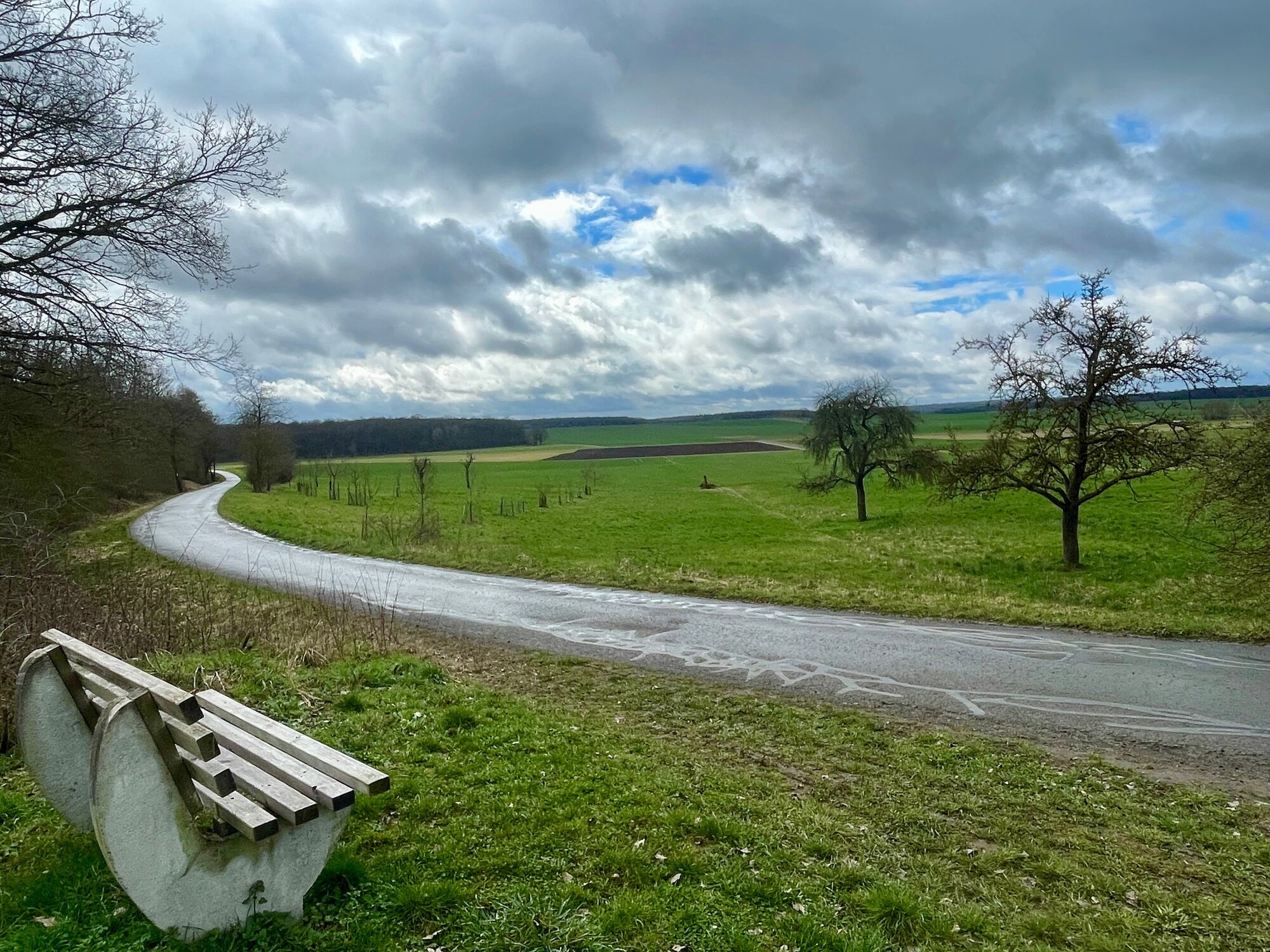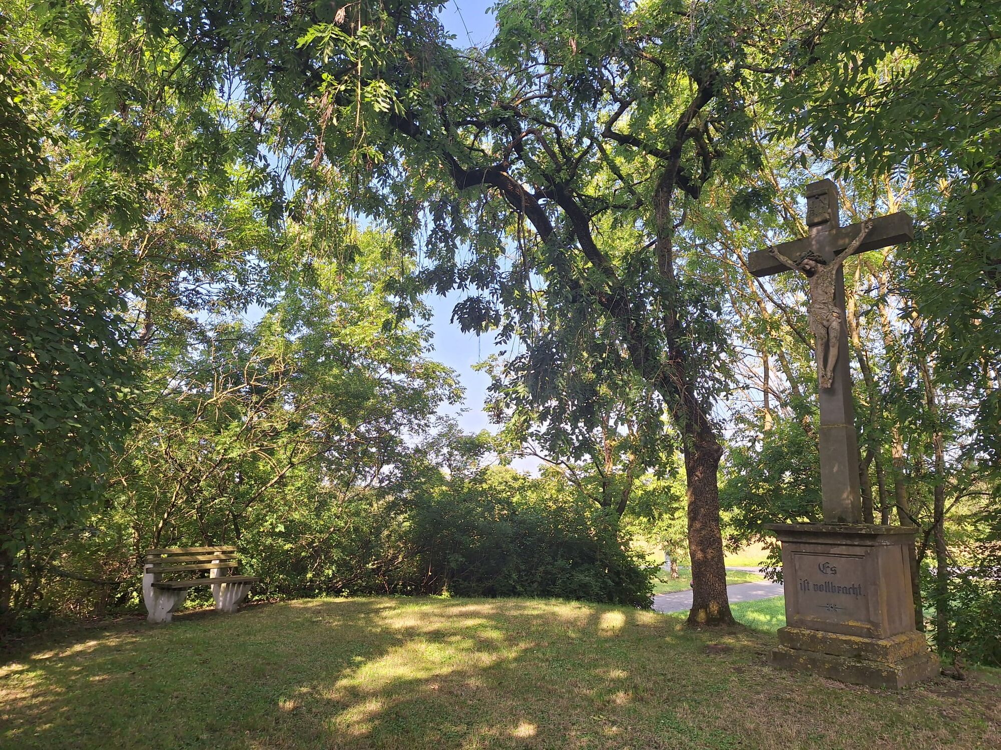 Entlang des Weges befindet sich rechts auf der Anhöhe in einem kleinen Wäldchen ein Kreuz mit einer Bank, der Christengarten. Danach führt der Weg am Sportplatz vorbei auf Asphalt bis zu einer schönen Bank mit einem herrlichen Ausblick. Folge dann den Schildern, die die Route als "3 auf grünem Kreis" markieren.