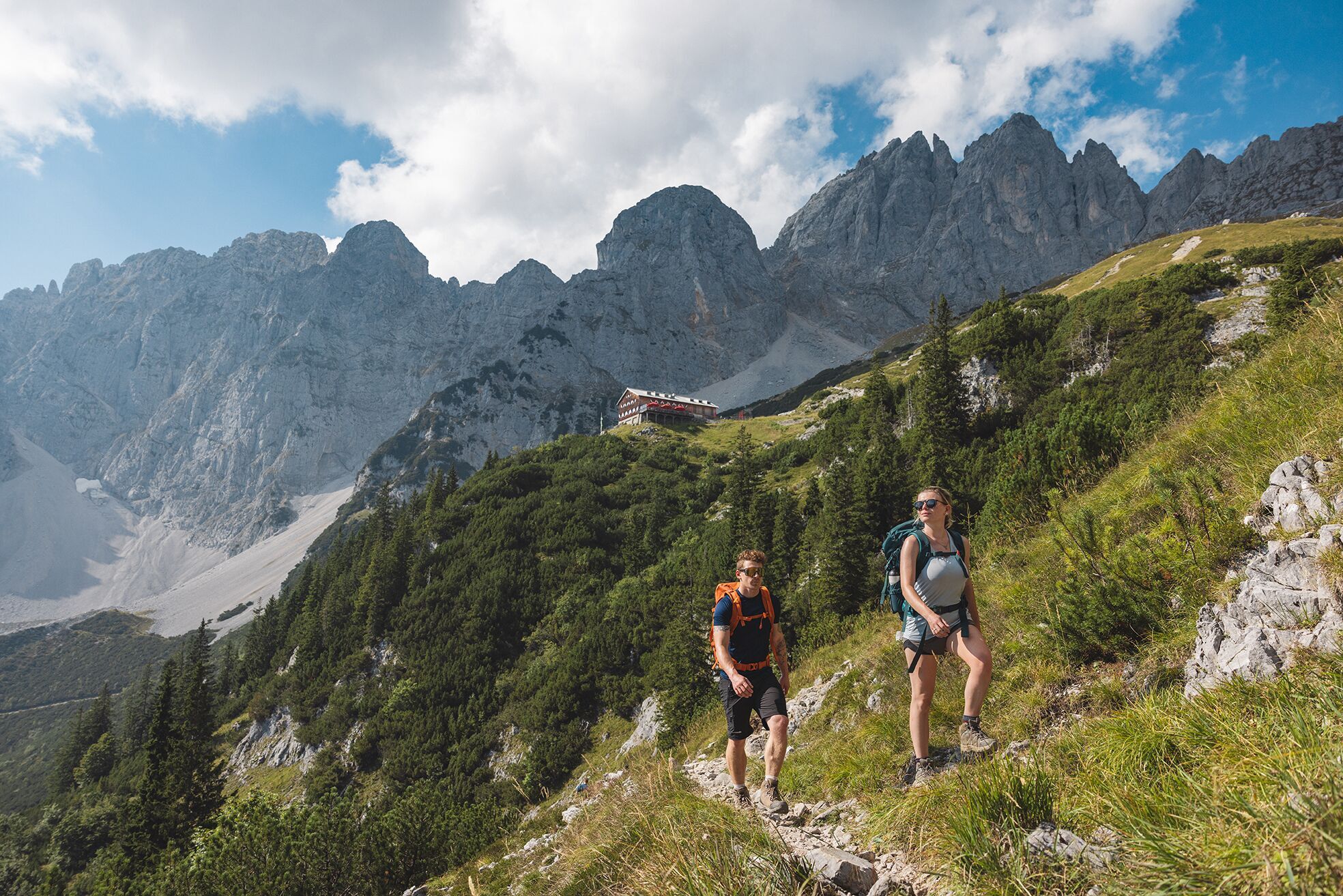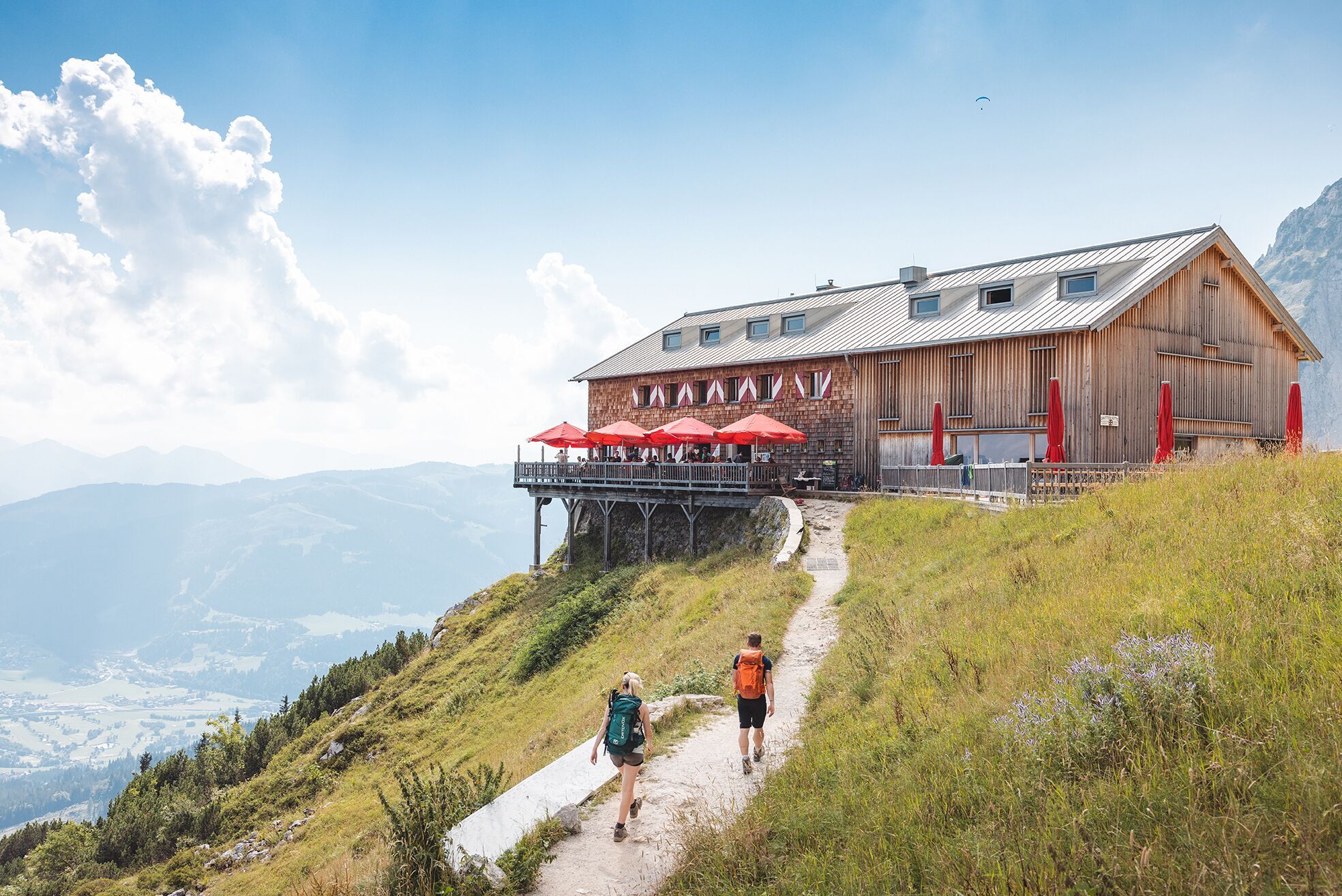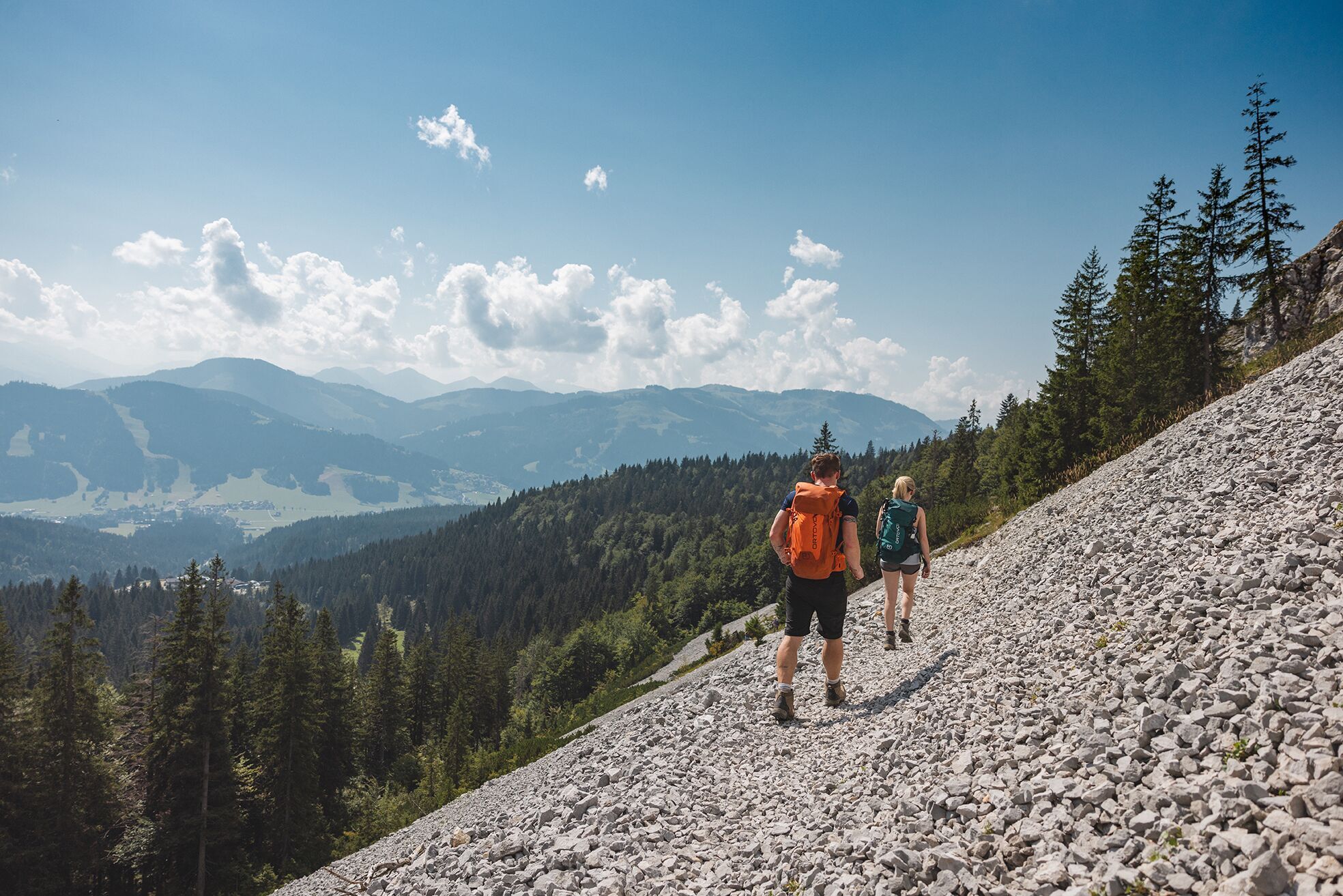 Sie kommen auf dem Steig 824 vom Bergsteigergrab und zweigen oberhalb der Gaudeamushütte auf den Steig 812a Richtung Süden Wochenbrunner Alm über Gamswegl ab. Diesem folgen Sie durch den Wald und über ein Geröllfeld. Wieder im Wald gelangen Sie dann zur Kreuzung mit dem Weg 825, welchem Sie Richtung Norden zur Gruttenhütte folgen. Dieser Steig führt großteils durch einen lockeren Wald bis zur Baumgrenze. Über ein Schotterkar und teils felsiges Gelände erreichen Sie zuerst den Gruttenkopf und dann die Gruttenhütte (1.620 m), die höchst gelegene Schutzhütte im Wilden Kaiser.