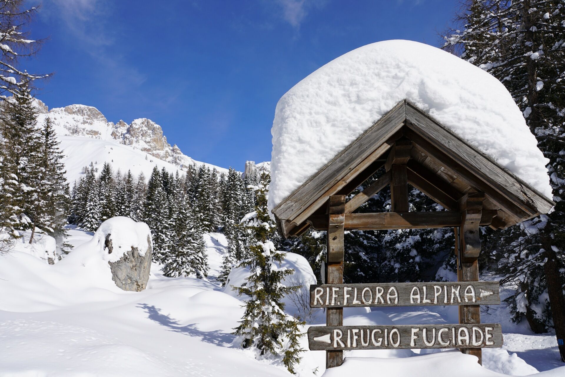 Von Moena erreichen Sie mit dem Auto den San Pellegrino Pass (ca. 11 km). Überqueren Sie den Pass und nach dem Parkplatz der Seilbahn Col Margherita biegen Sie links auf die asphaltierte Straße, die zur Fuciade Hütte und zur Flora Alpina Hütte führt.
